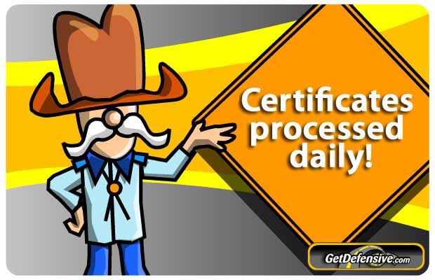 PLEASE NOTE: if you have selected regular US Mail, it will take at least 5 to 10 business days for your certificate of completion to be delivered. If you upgrade to Federal Express, your defensive driving certificate can be delivered as early as the morning after you complete your course. FedEx also delivers on a business day schedule, so if you complete your course on Friday and select Fedex overnight shipping your certificate will be delivered by or before 5PM on Monday.